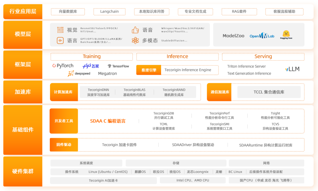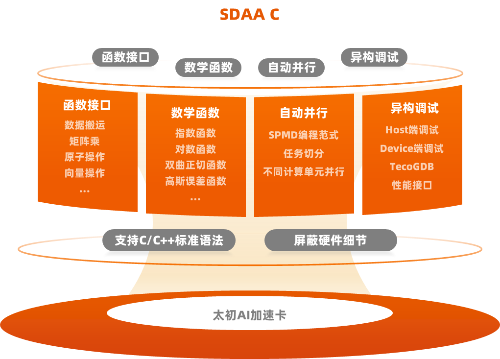SDAA C運行于基礎(chǔ)組件層,對下屏蔽了硬件的物理特性,對上提供了豐富的編程接口,以及代碼調(diào)試、調(diào)優(yōu)工具。無需感知底層的硬件細節(jié),僅需遵從SDAA C的規(guī)范即可使用太初AI加速卡,為高并發(fā)、大數(shù)據(jù)運算提供強有力的算力支撐。