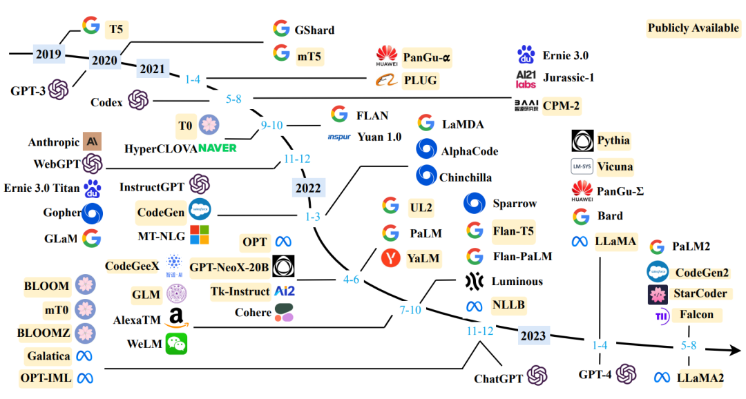 圖4 大語言模型近3年發(fā)展時(shí)間線,引用自[2]