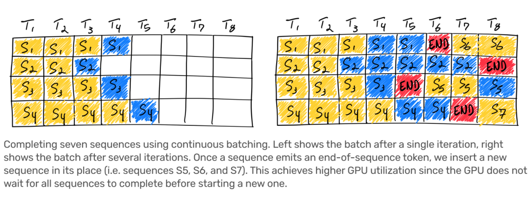 Continuous batching在進(jìn)行batch>1的推理場景下,一旦batch中的某一個(gè)序列推理完成,那么就可以在之后插入一個(gè)新序列,從而充分利用GPU使用率。